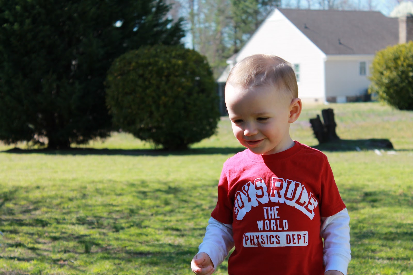 Outside is when we spend most of our time now that the weather has been so nice. Landon loves running around, picking up sticks, looking at airplanes, and chasing the cats around. We really want to get a fence to keep him in our yard. He loves to go into the neighbor's yard. He has made some new friends with the neighbors that live behind us. (See picture below)